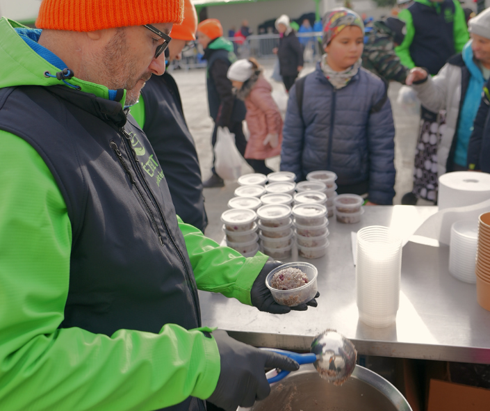 A 3. kerület rászoruló családjai ezen a napon nemcsak élelmiszert, hanem reményt is kaptak. Krisna-völgyi sütőtök illata, a frissen készült forró székelykáposzta gőze és a mosolygó önkéntesek gondoskodtak arról, hogy már az érkezés pillanatában különleges legyen a hangulat.
